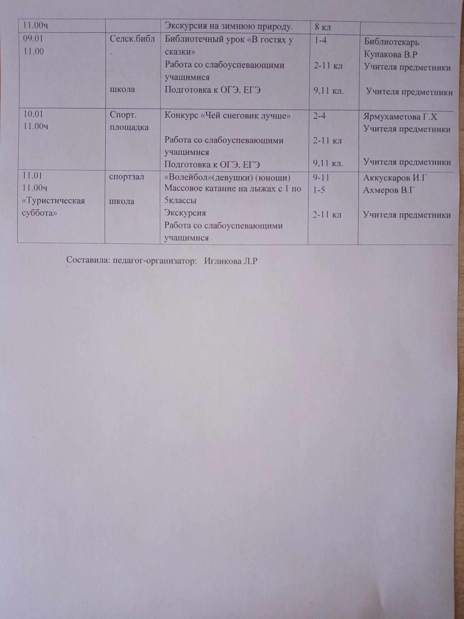 План мероприятий в период зимних каникул